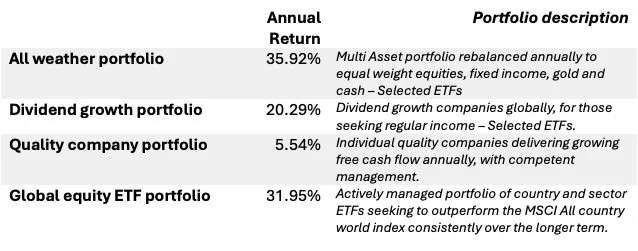 We are pleased to present the 2025 performance summary for our four distinct portfolios; each tailored to different risk and return profiles.