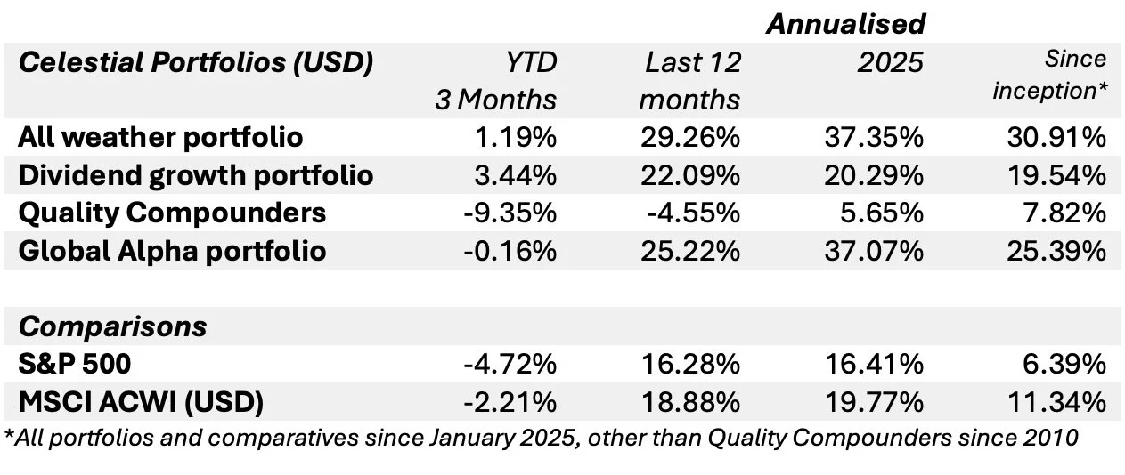 Investing in financial markets involves inherent risks, including the possible loss of capital. The performance of the Celestial portfolios, as presented in this report, reflects historical results and should not be interpreted as a guarantee of future returns. Market conditions can change rapidly due to a variety of factors, including economic developments, geopolitical events, changes in interest rates, and fluctuations in currency and commodity prices.