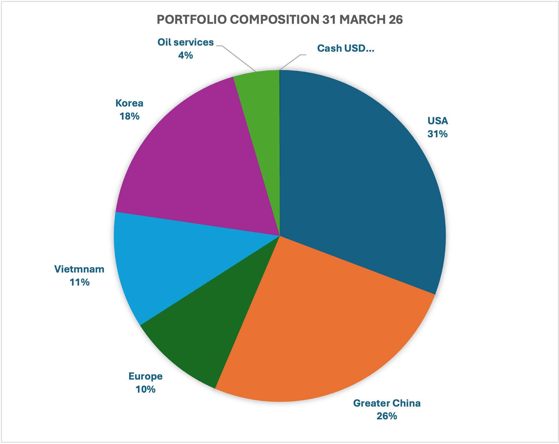 The only portfolio change in January was the acquisition of the Oil Services ETF from the dividends received in 2025. The portfolio composition by country and industry on 31 March 2026 is as follows: